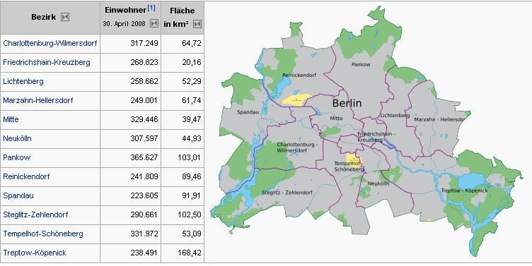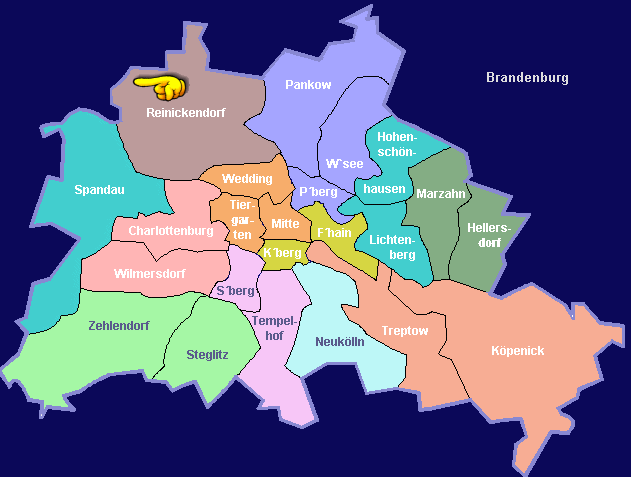 Berlin gliederte sich nach der Wiedervereinigung in 23 Bezirke (12 Westbezirke und 11 Ostbezirke). Ich habe Euch hier mal markiert, wo ich in etwa wohne.