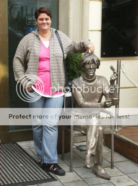Hier krault meine Schwester in der Altstadt einer Statue das Köpfchen