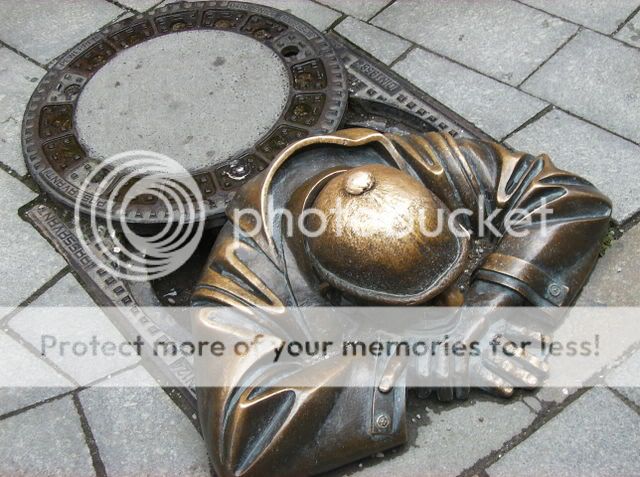 Diese Statue lehnt sich mitten am Gehsteig aus dem Gully